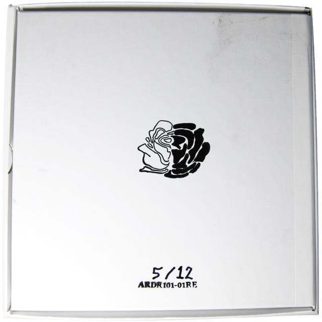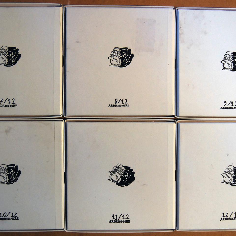 Please take the DIY-nature of this release into account when ordering, as there are inconsistencies between copies as far as the spraypaint/stamp accuracy goes for instance. We've obviously done our utter best to make this a beautiful release, but please do not expect 'factory-results' from a non-factory product. The white boxes also came shipped with some particularly difficult-to-remove stickers on them, so sadly enough some glue residue is still present on the back.